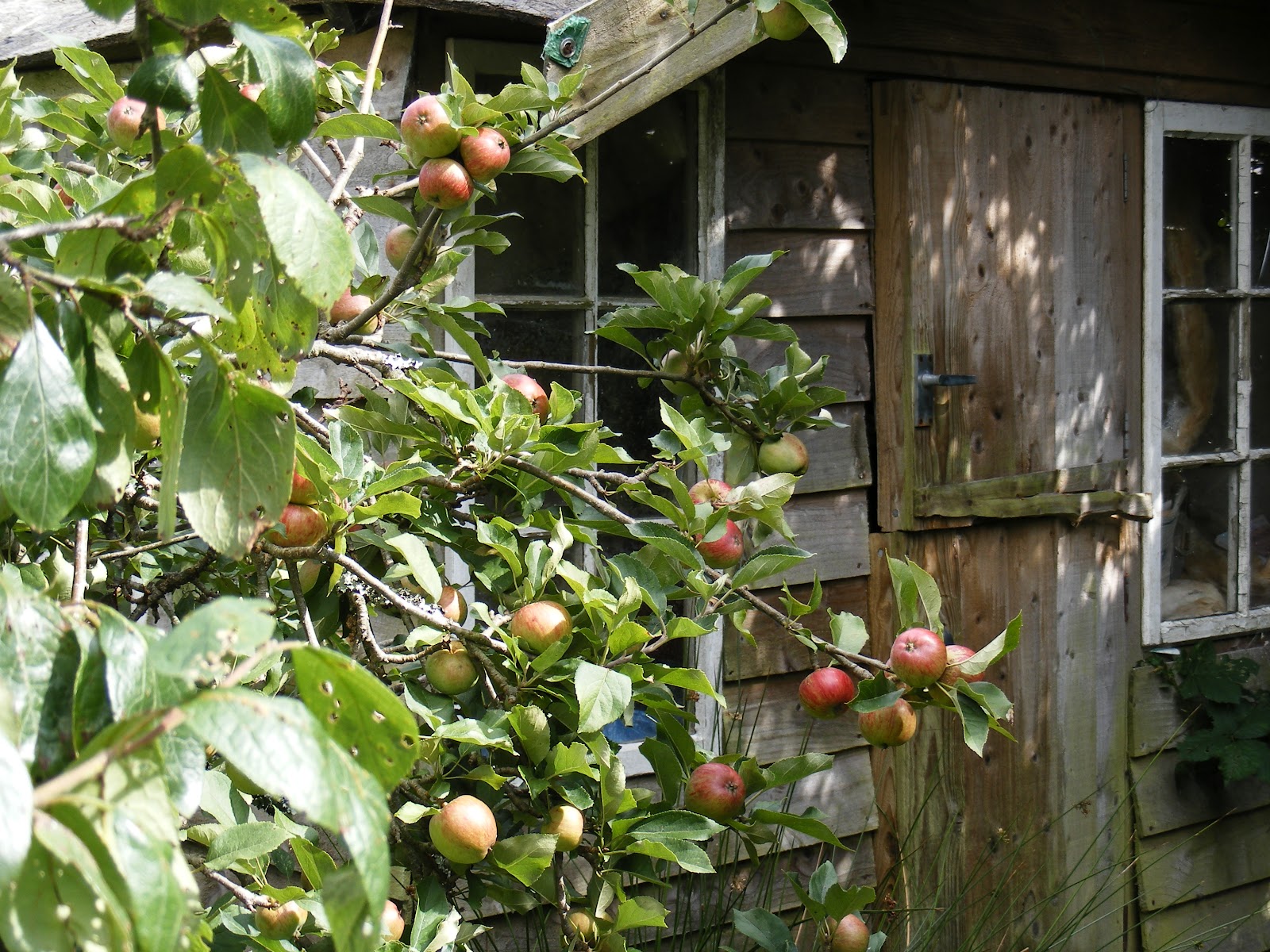 Gathering the windfalls from the gnarled old apple tree and peeking into the wooden writing room nestled just behind.